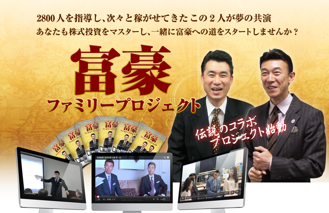「富豪ファミリープロジェクト」は、元ファンドマネージャーであり800人を超すお弟子さんを持つ現役株式投資家の『相場師朗氏』と、 約2000人もの投資スクール生への指導経験を持ち元国内証券会社での勤務経験もある投資家講師の『紫垣英昭氏』がタッグを組んで結成された、本物の株式投資をマスターし、しっかりとお金を稼いでいただき、豊かな素晴らしい人生を送るためのビッグプロジェクトです。